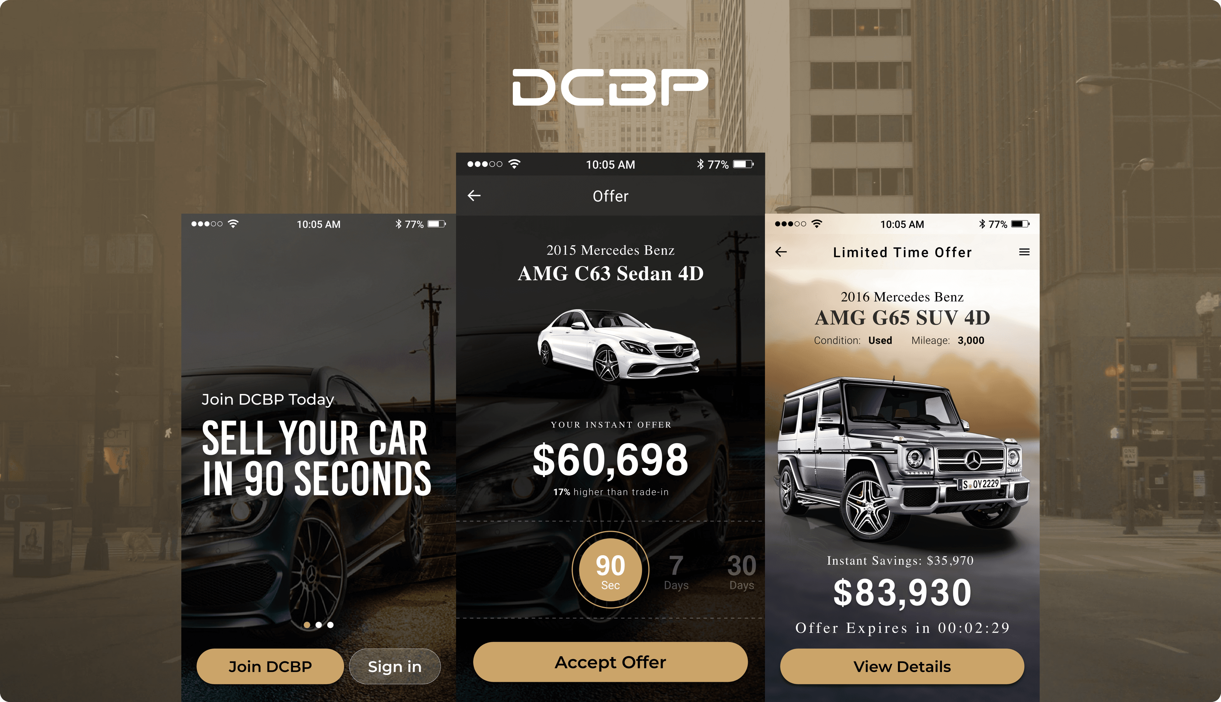 The DCBP Seller Mobile app helps individuals sell their used cars in under 90 seconds - completely online, with zero haggling or hassle. Instead of dealing with flaky buyers or predatory dealers, users receive an instant offer and enjoy a frictionless pickup and payout process. I led the design and product direction for this mobile experience.